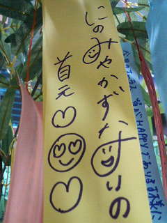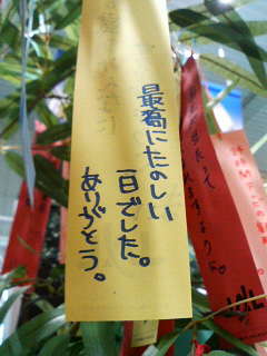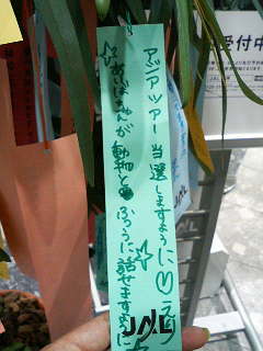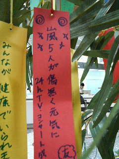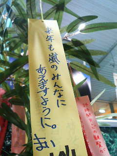 七夕の短冊いいでしょう?最初は単に七夕飾り好きだから寄っていったんだけど、よくよく見たら嵐ファンの短冊がいっぱいあってね。小一時間は余裕で楽しめる内容でした。嵐のメンバーはその日のうちに帰ったみたいだから、っていうかそもそもあれを見る余裕なんてなかっただろうけど、見て欲しかったなあって思いますよ。嵐ファンのメッセージ、みんな可愛くてねえ。